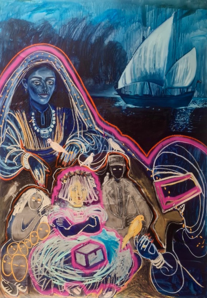 The verdict of the wolf, acrylic, oil paint and pigment stick on canvas, 400 w x 200 h cm, 2021.Invisible friends, mixed media on canvas, 350 h x 215 w cm, 2021.The dancing beauties, mixed media on canvas, 400 h x 215 w cm, 2021.Perfect behaviour, oil paint and pigment stick on canvas, 700 w x 215 h cm, 2021.