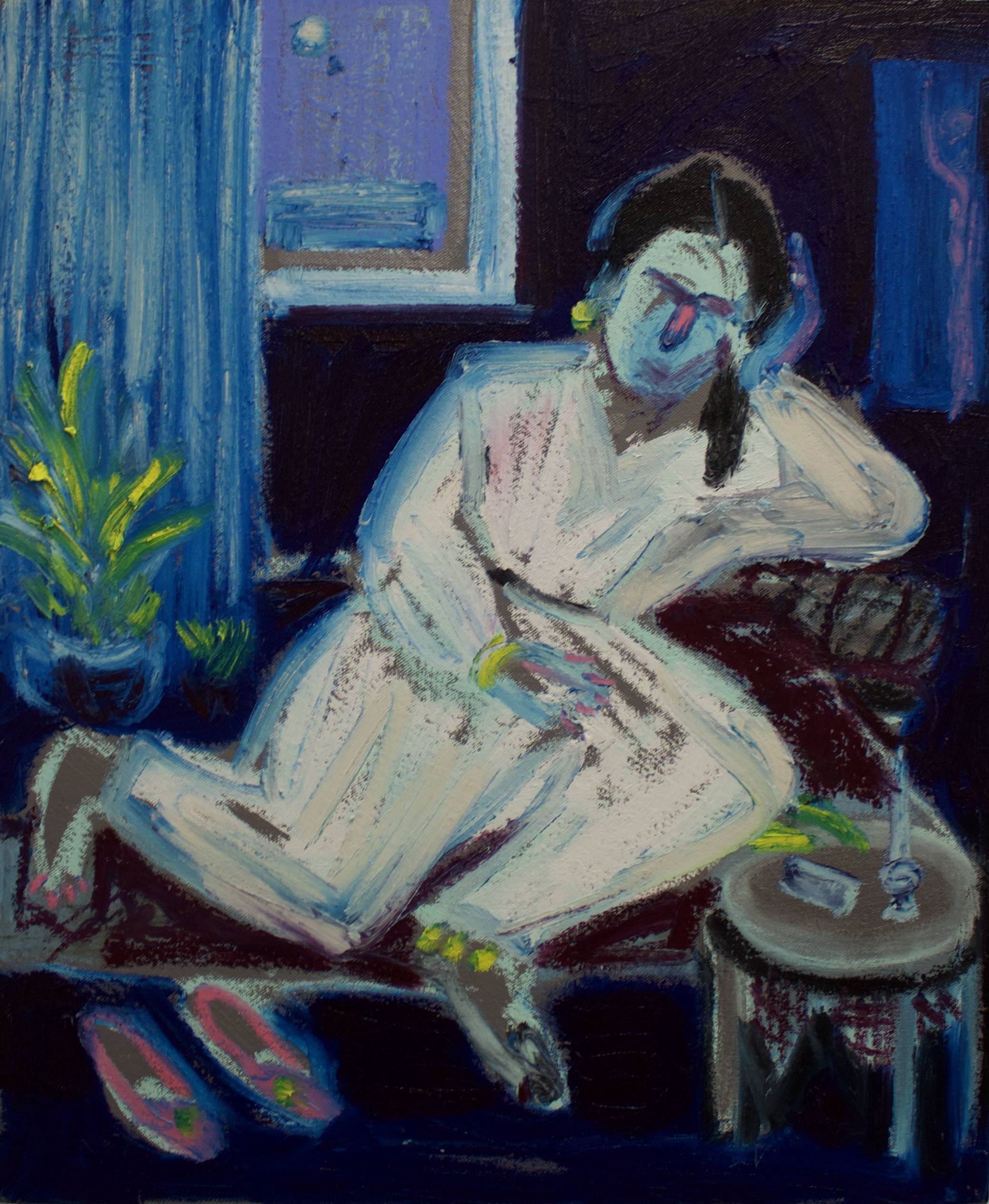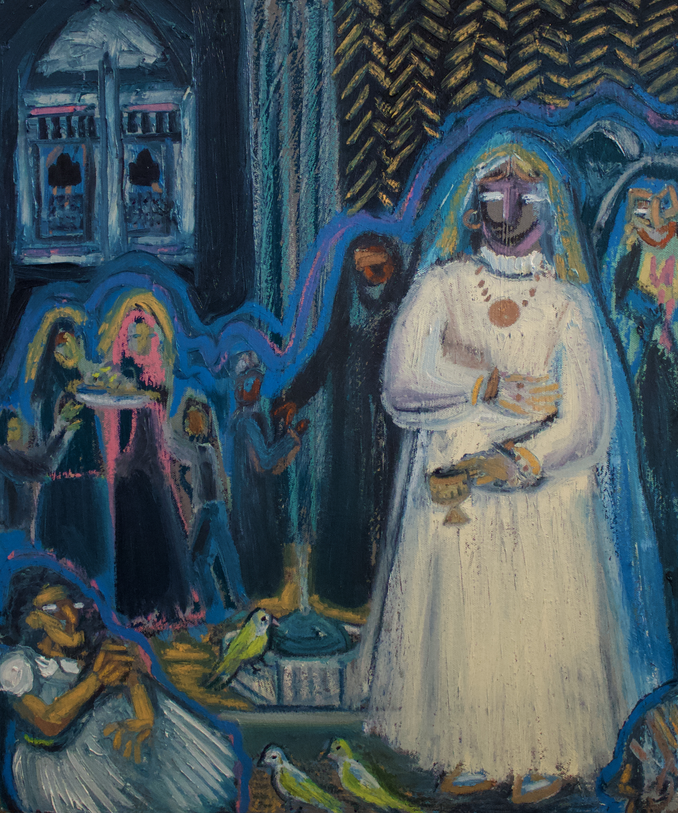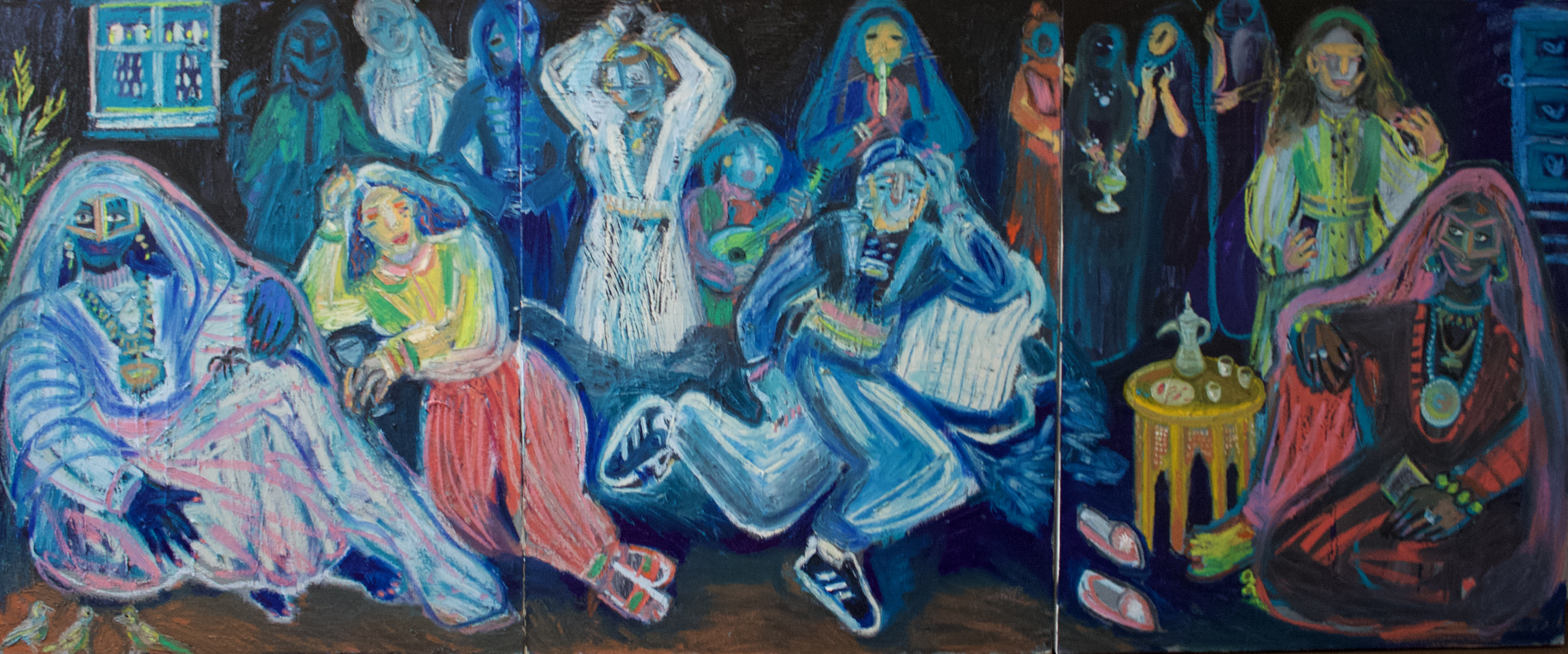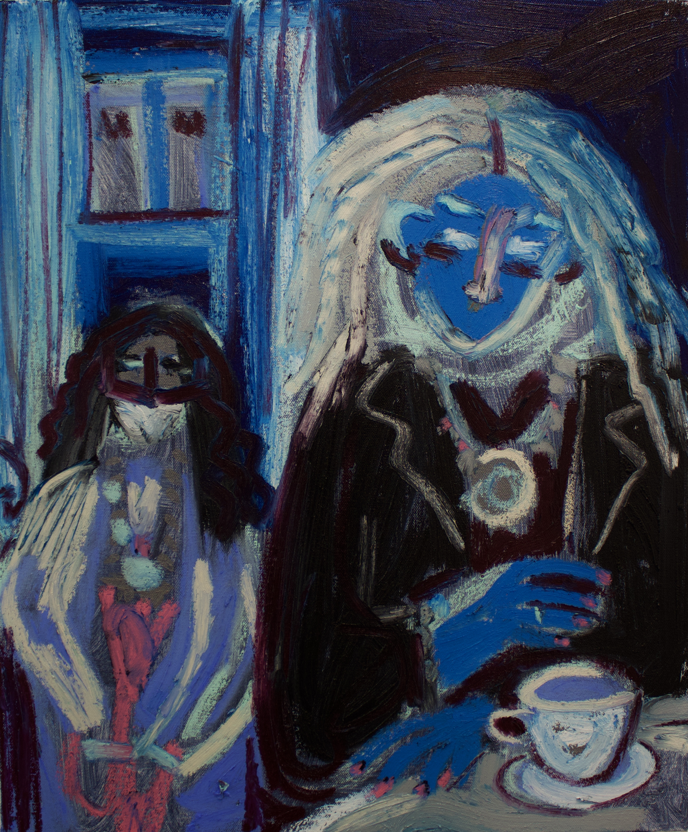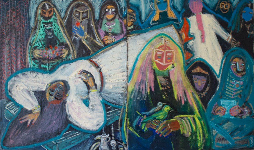 Reading tea leaves, oil paint and pigment stick on canvas, 100 w x 60 h cm, 2021.The Influencer, oil paint and pigment stick on canvas, 100 w x 60 h cm, 2021.The boudoir, oil paint and pigment stick on canvas, 100 w x 60 h cm, 2021.First teeth, oil paint and pigment stick on canvas, 100 w x 60 h cm, 2021.The fountain, oil paint and pigment stick on canvas, 100 w x 60 h cm, 2021.The ancestors garden, oil paint and pigment stick on canvas, 100 w x 60 h cm, 2021.Tweets and Goodbye kisses, oil paint and pigment stick on canvas, 100 w x 60 h cm, 2021.The call, oil paint and pigment stick on canvas, 100 w x 60 h cm, 2021.The stories we forget diptych, oil paint and pigment stick on canvas, 100 w x 60 h cm, 2021.Subtle signals triptych, oil paint and pigment stick on canvas, 100 h x 240 w cm, 2021.
