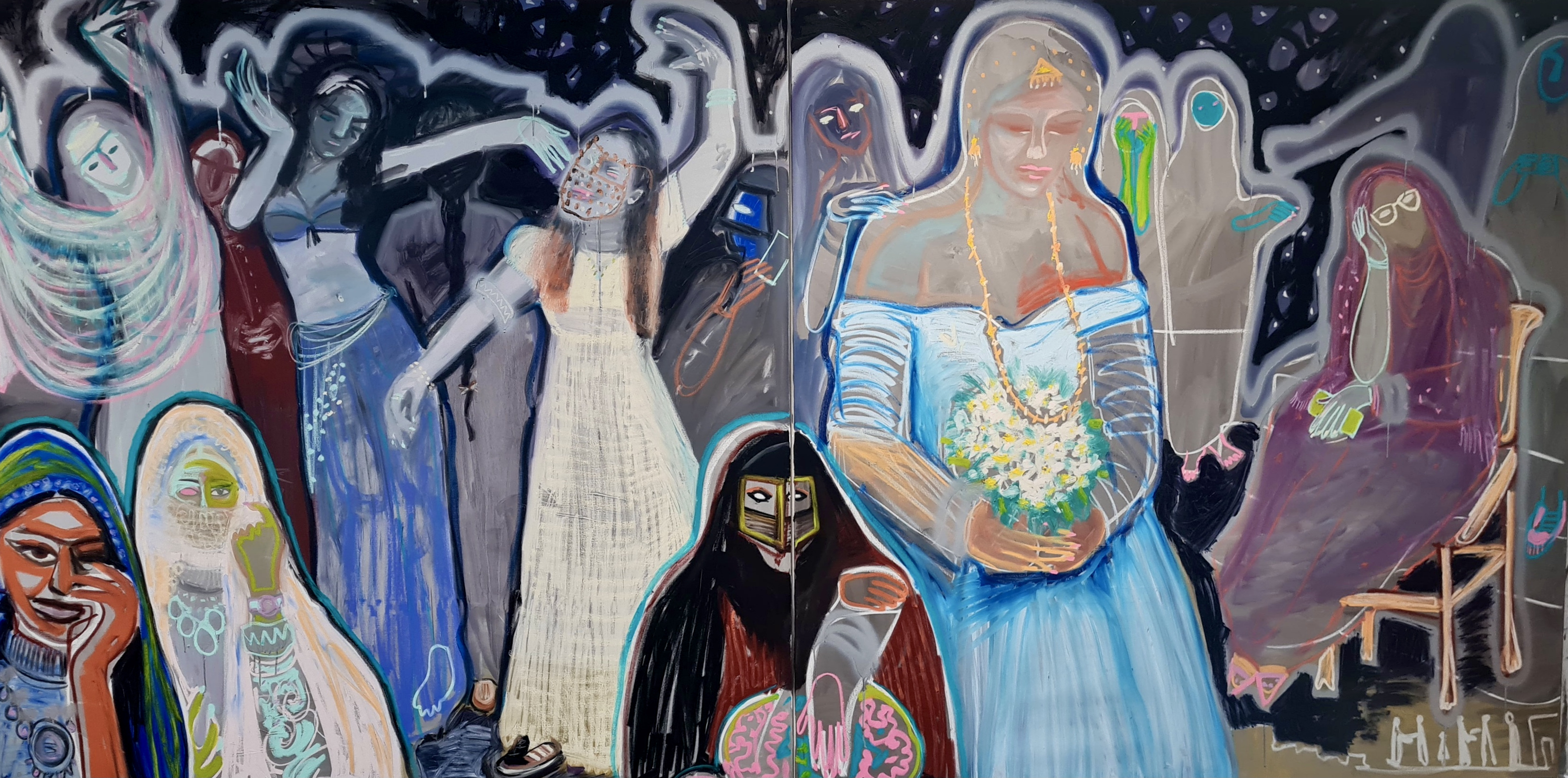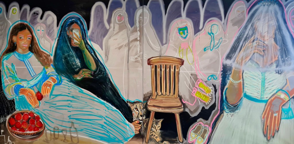 Part 1 – Leopard, kiss, selfie, mixed media on canvas, 180 x 180 cm, 2021.Part 2 – Leopard, kiss, selfie, mixed media on canvas, 180 x 180 cm, 2021.Full image – Leopard, kiss, selfie, mixed media on canvas, 180 x 180 cm, 2021.