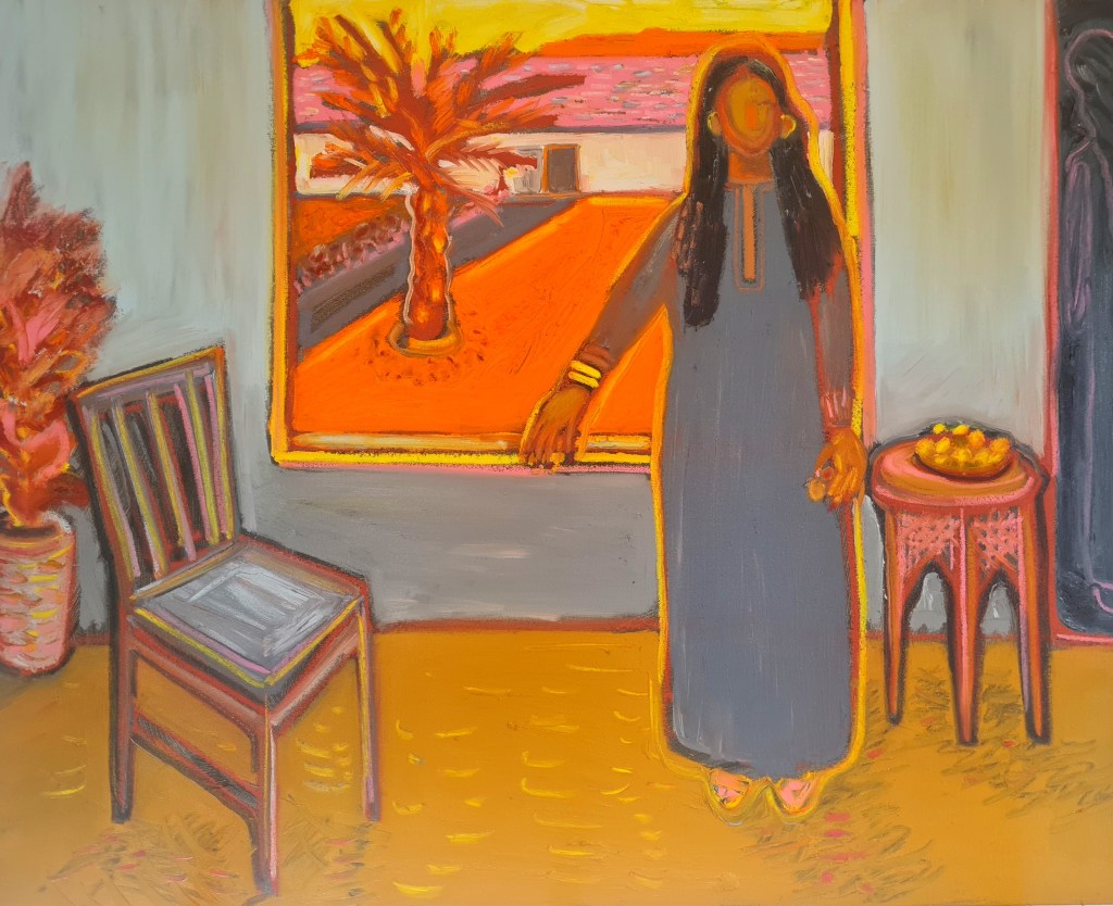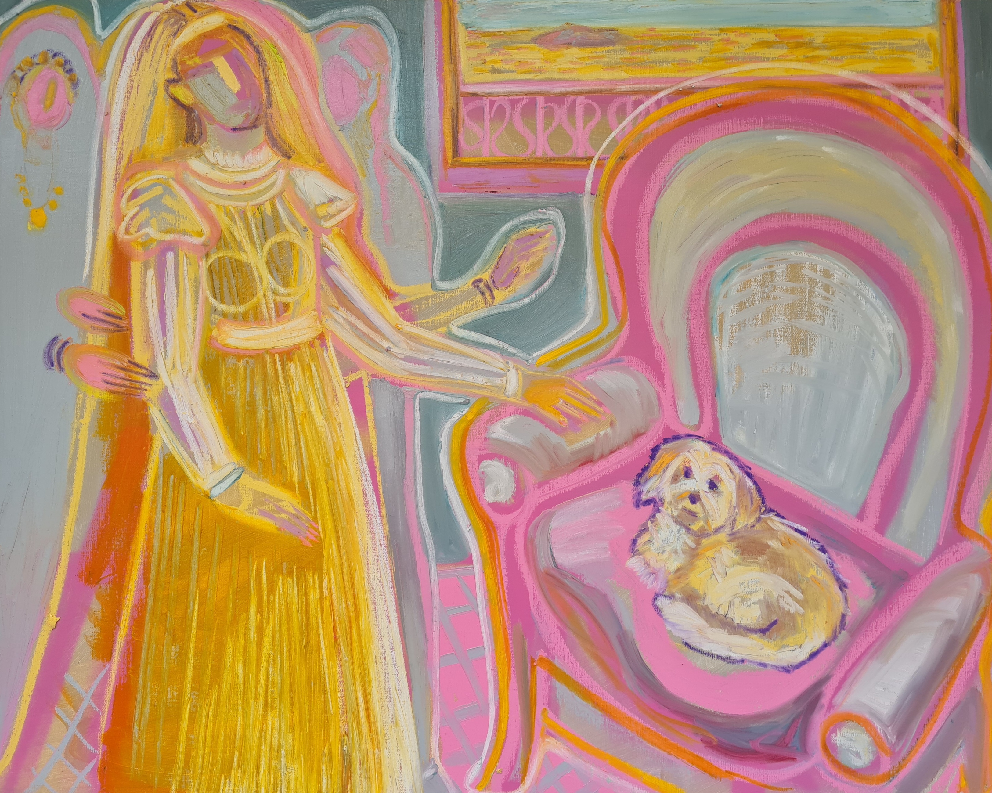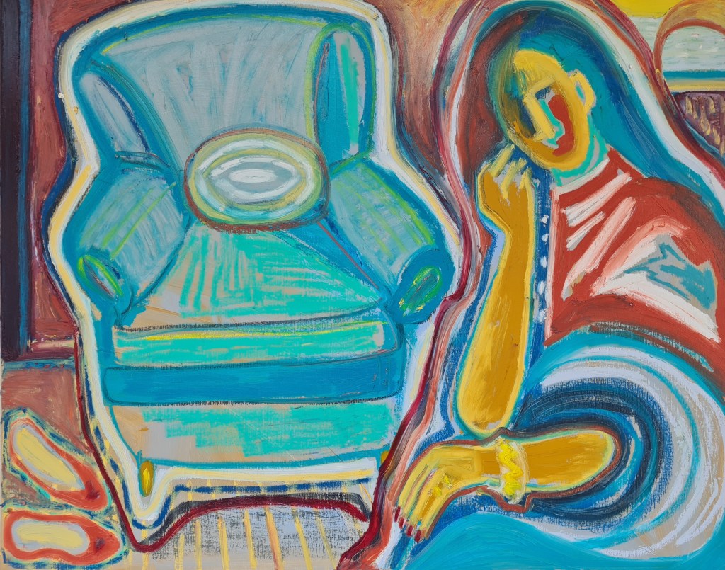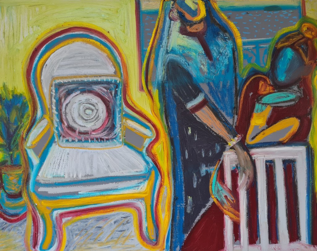 Her chair, 100 w x 80 h cm, acrylic and pigment stick on canvas, 2022.