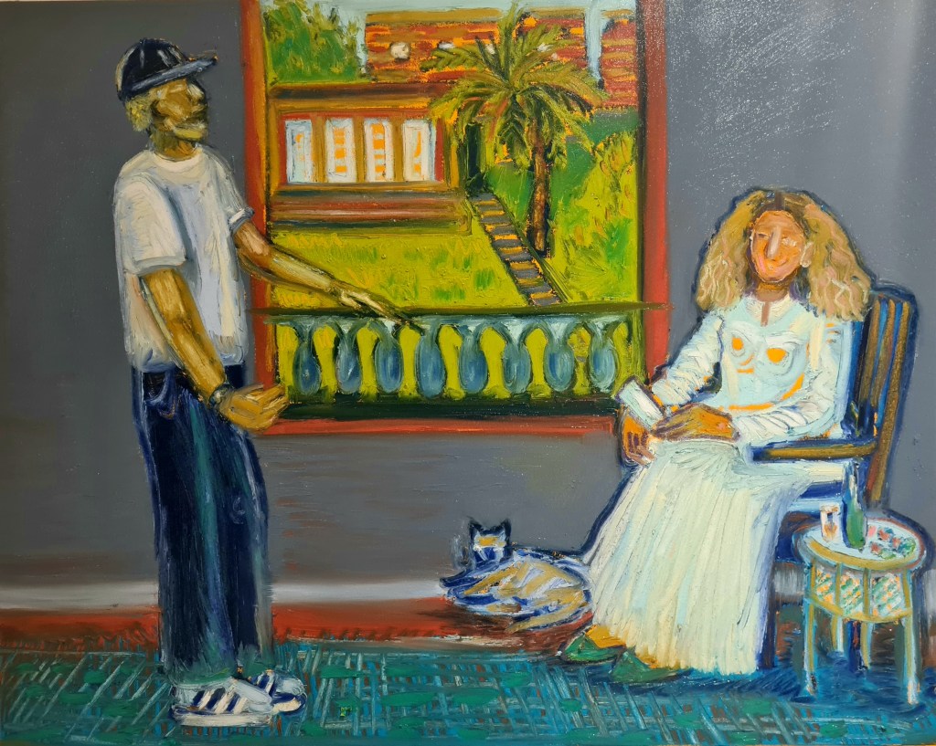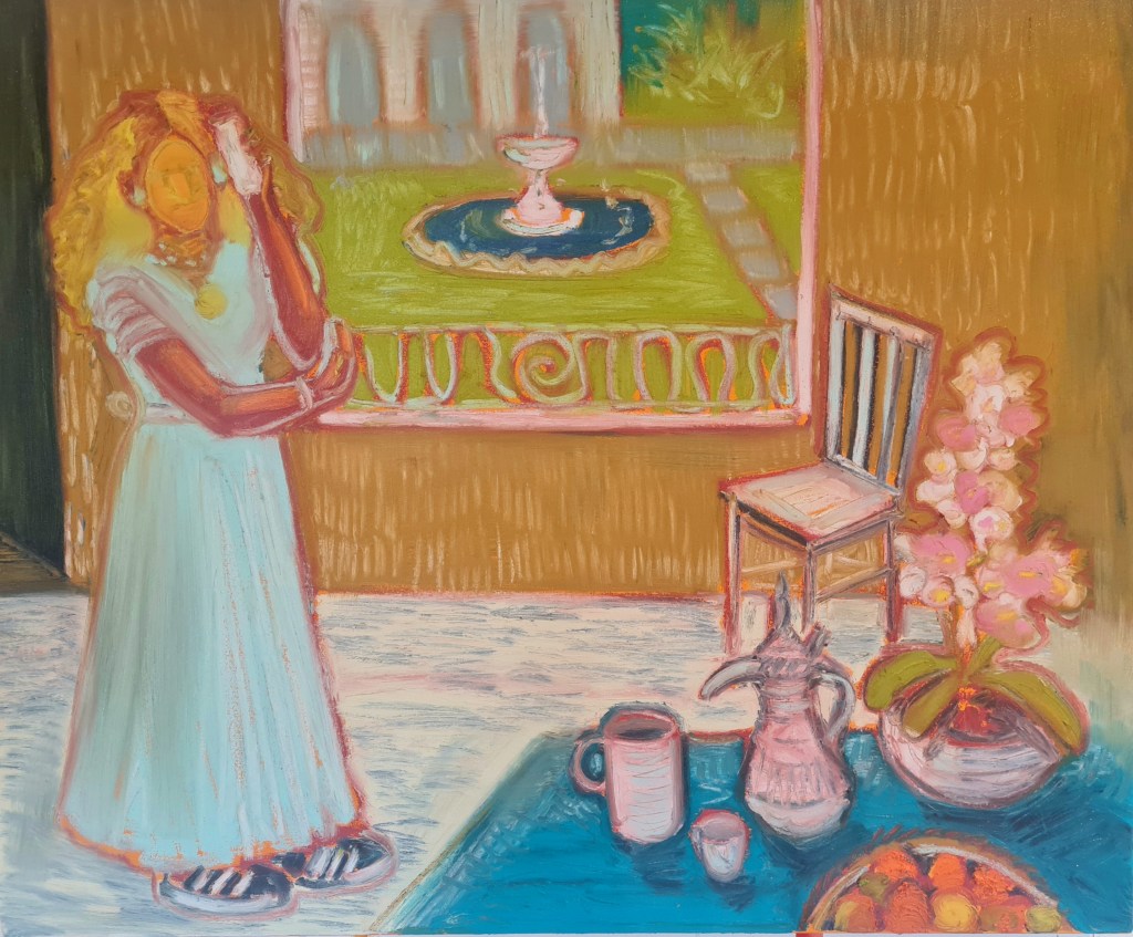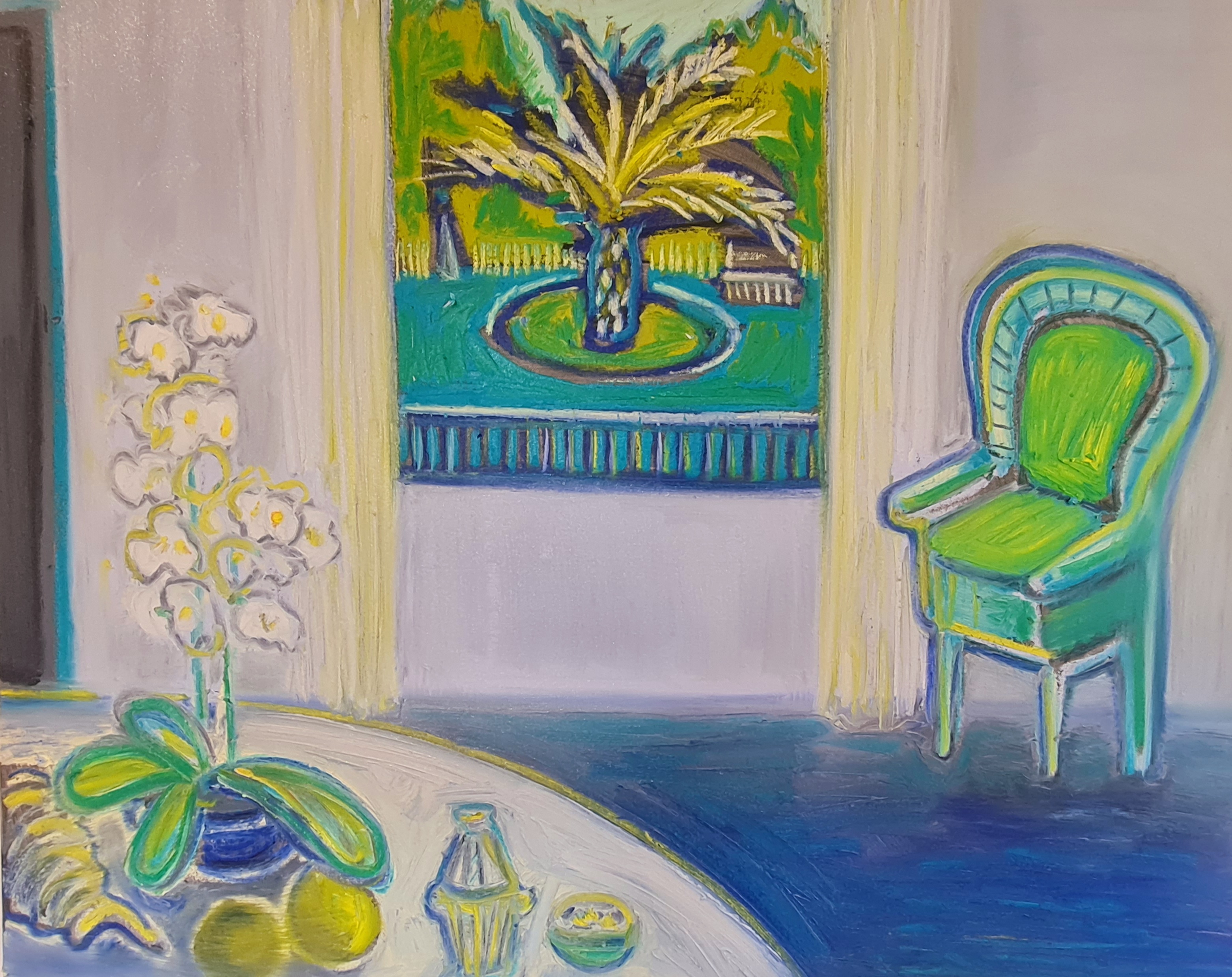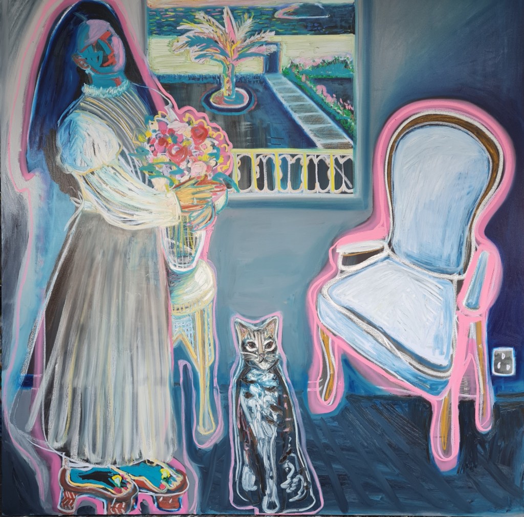 Her chair, 100 w x 80 h cm, acrylic and pigment stick on canvas, 2022.