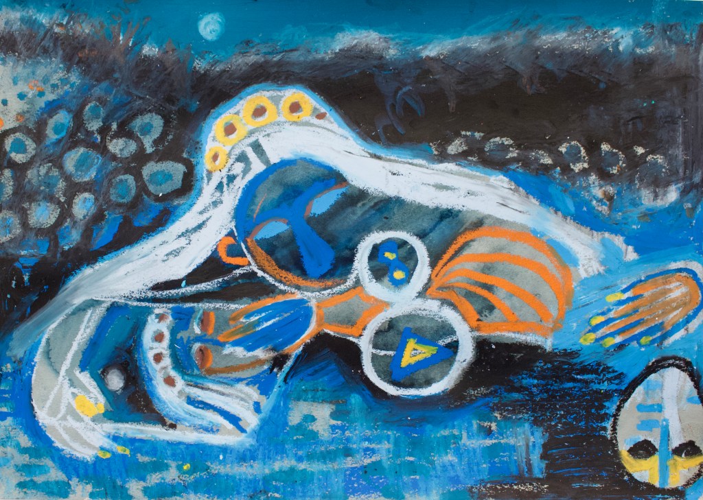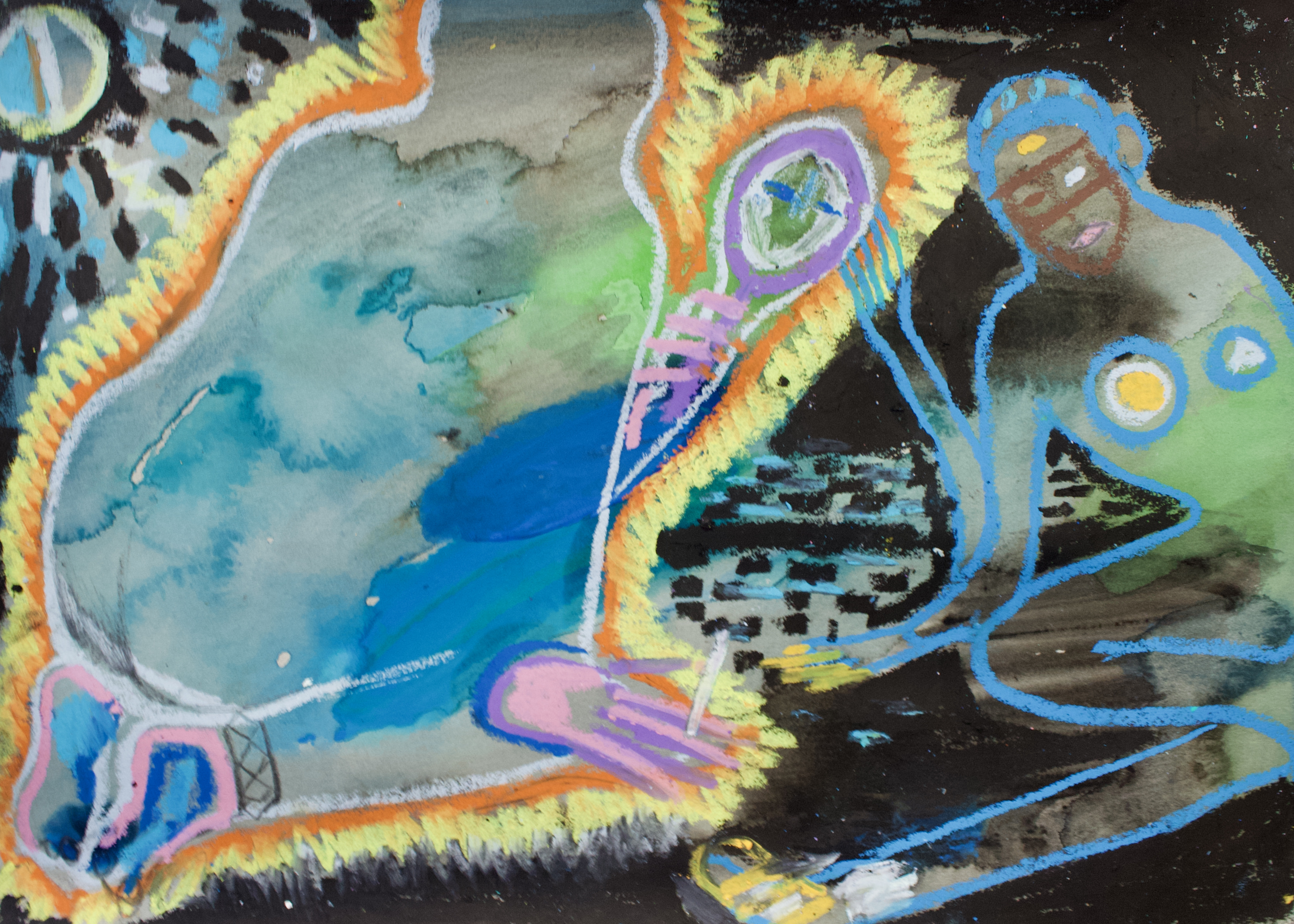 Moonlight caress, 22h x 30 w cm, watercolour, pencil and oil pastel on paper, 2022.