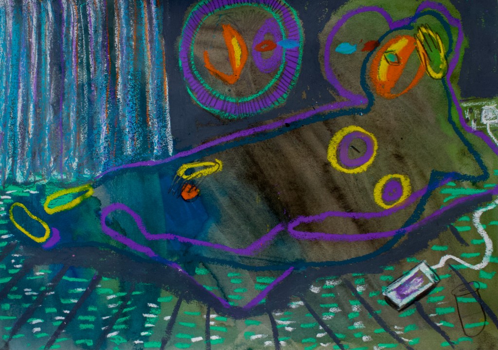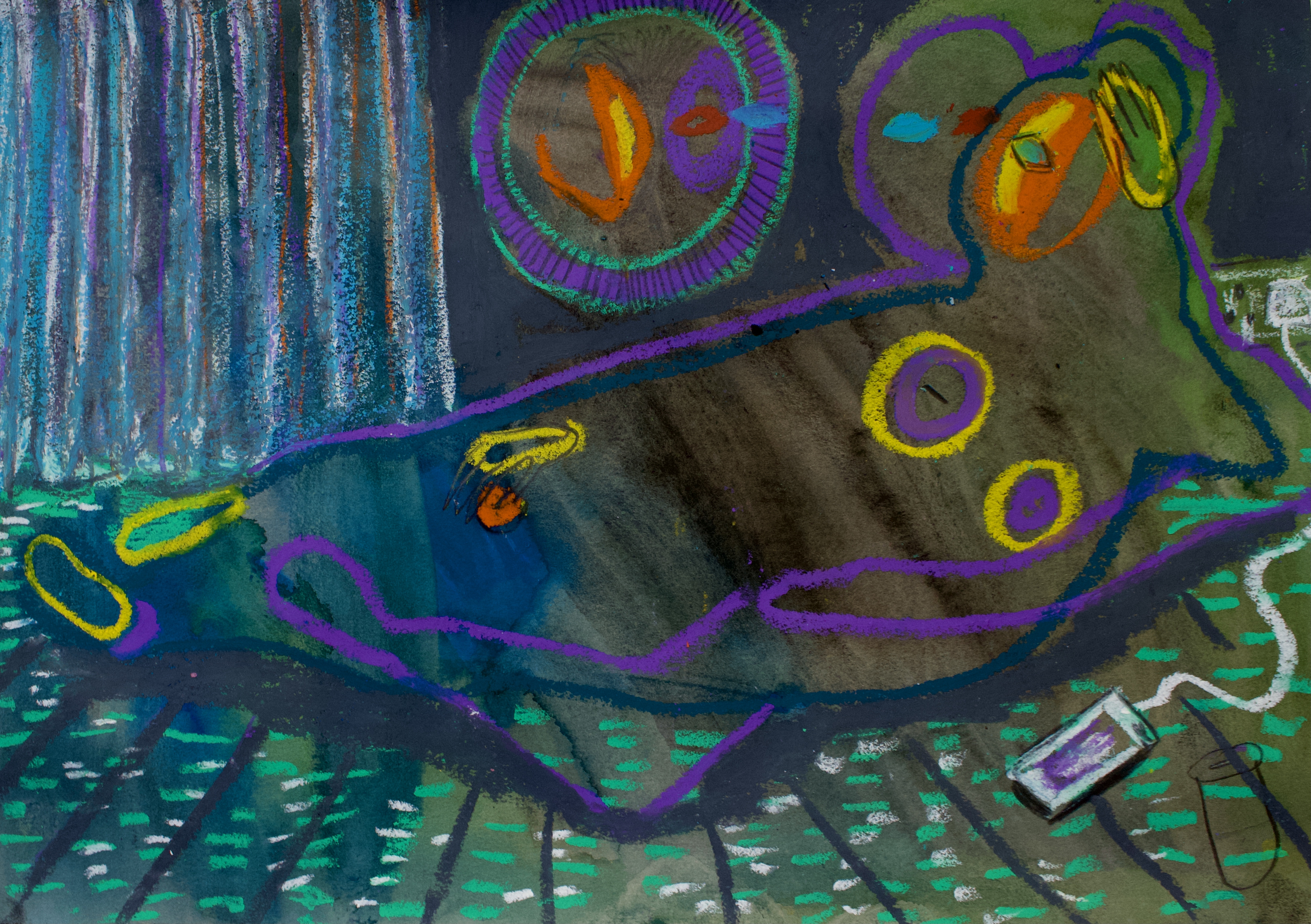Down by the water, 22h x 30 w cm, watercolour, pencil and oil pastel on paper, 2022.