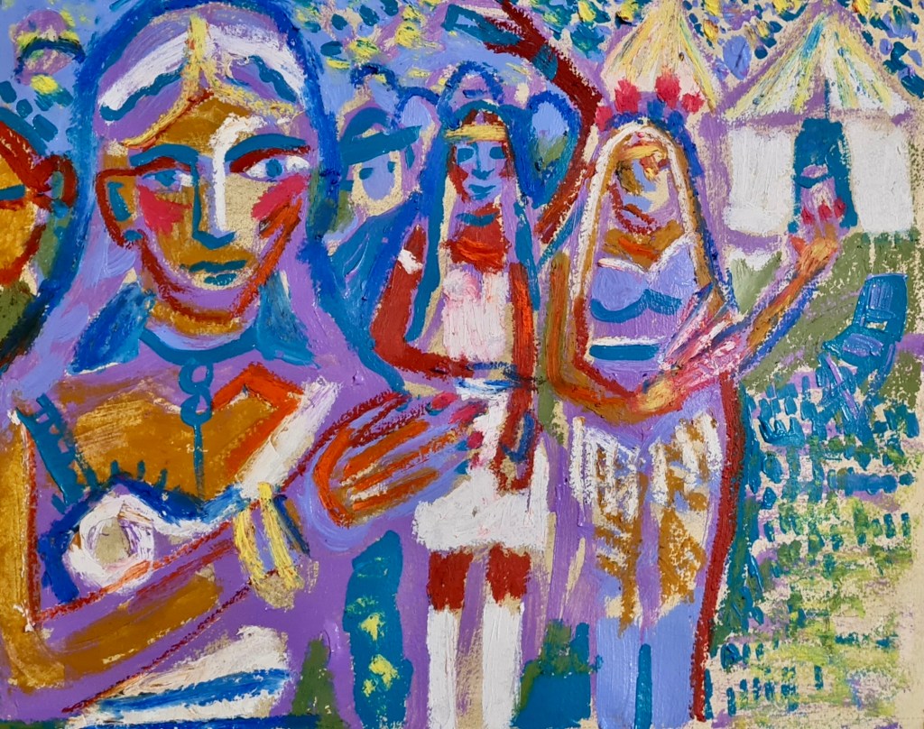Walking to your tent, 30 w x 21 h cm, acrylic and oil pastel on paper, 2022.
