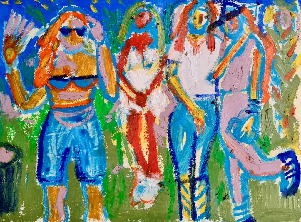 Meet me outside, 30 w x 21 h cm, acrylic and oil pastel on paper, 2022.