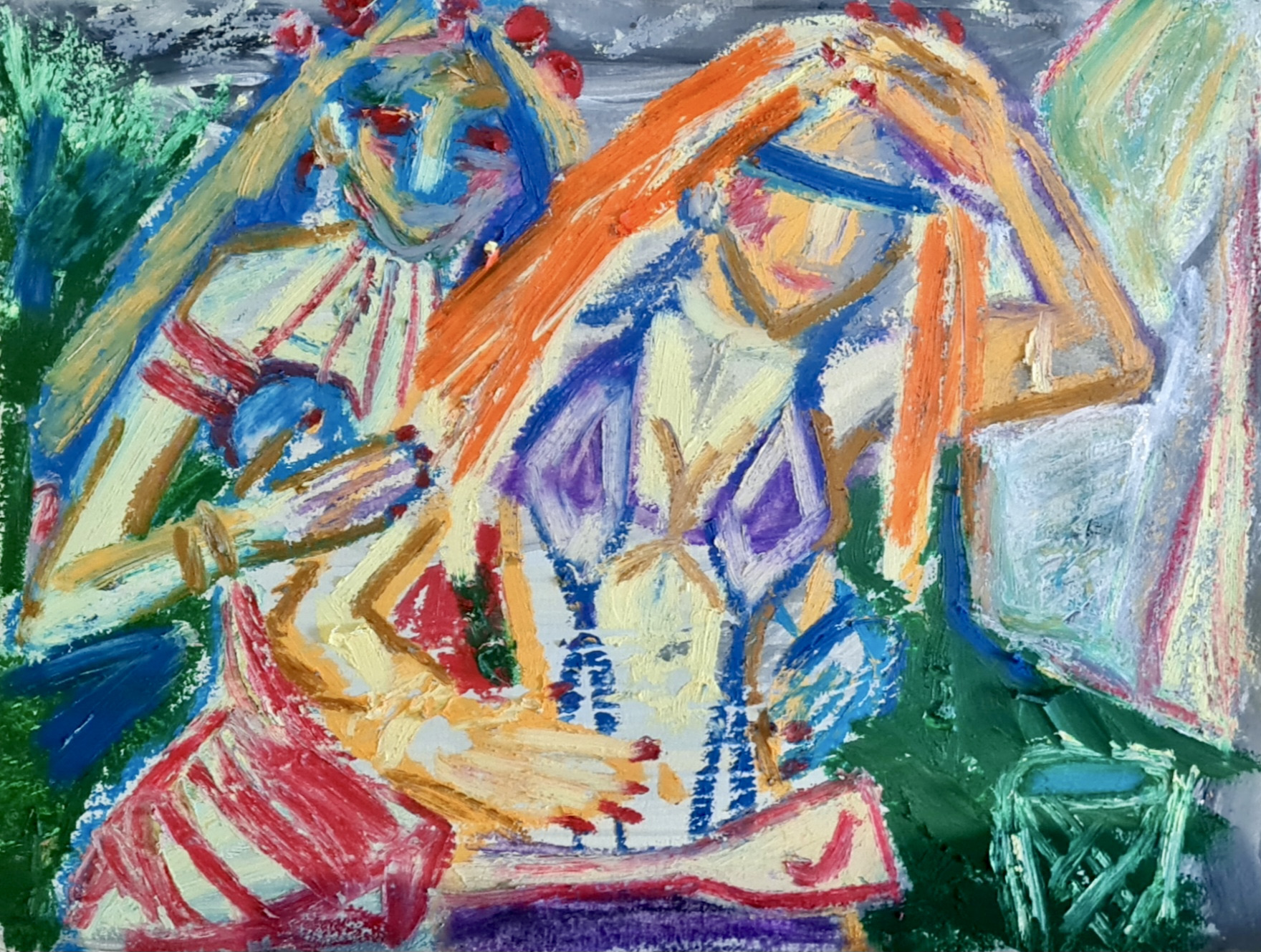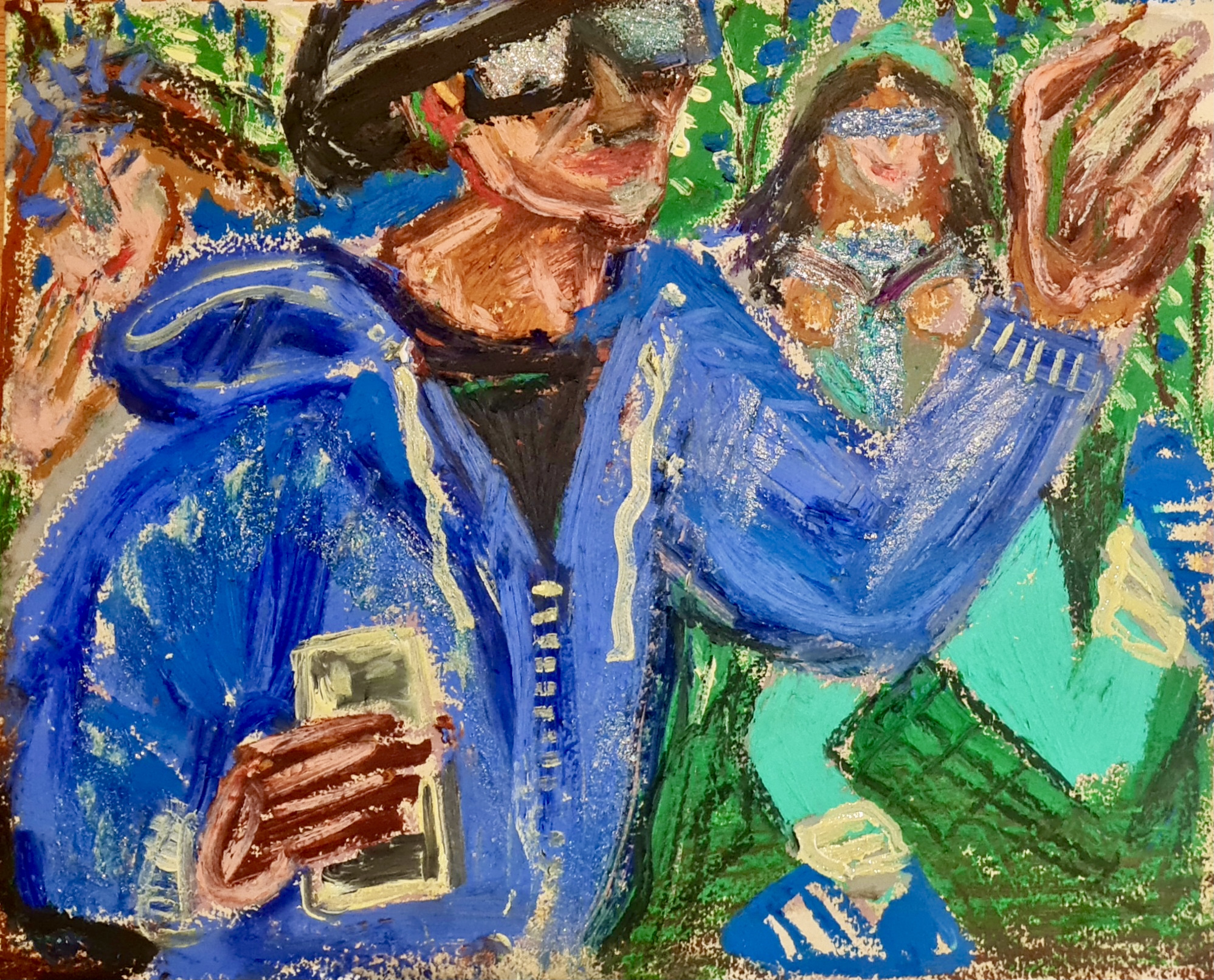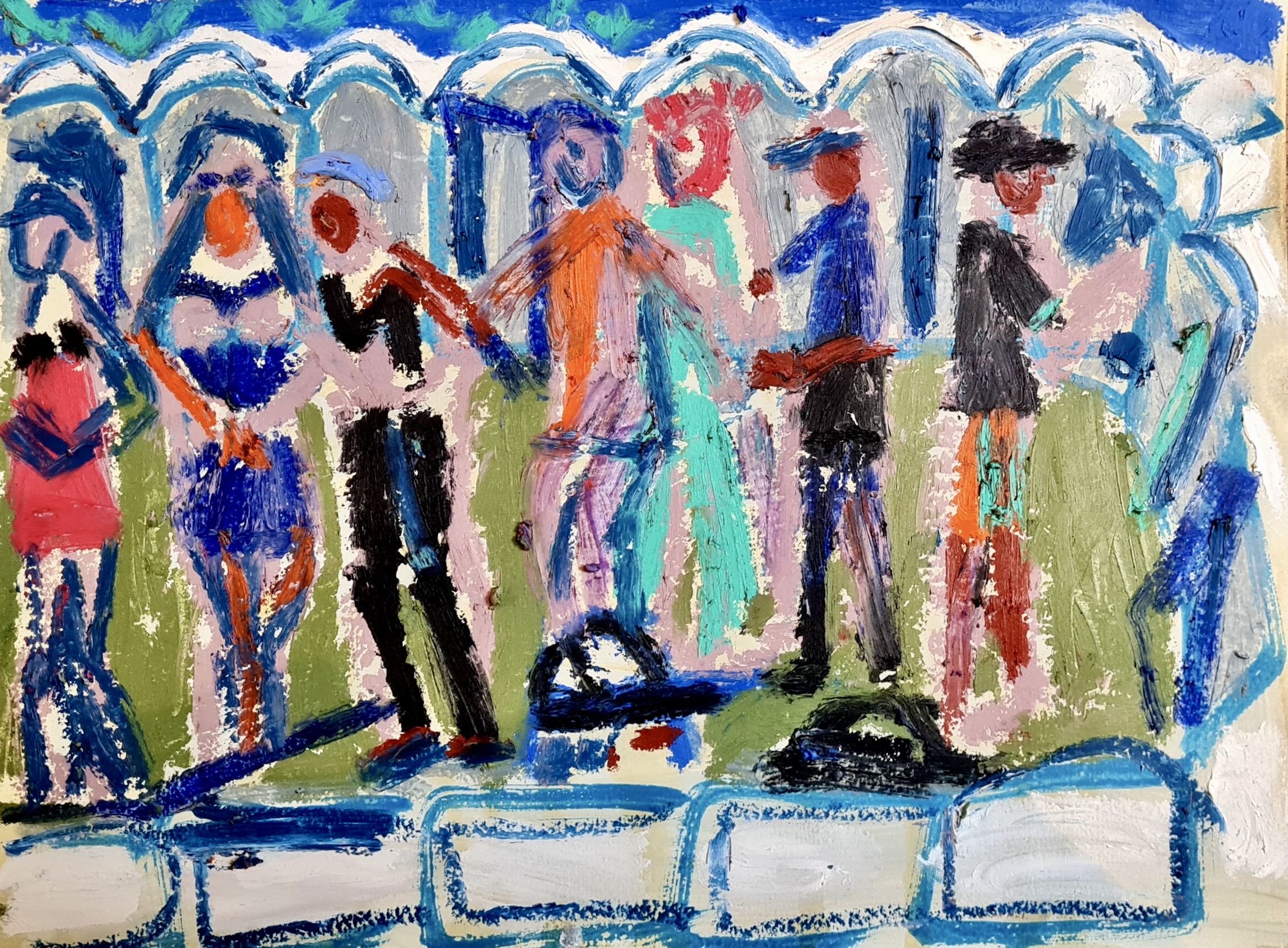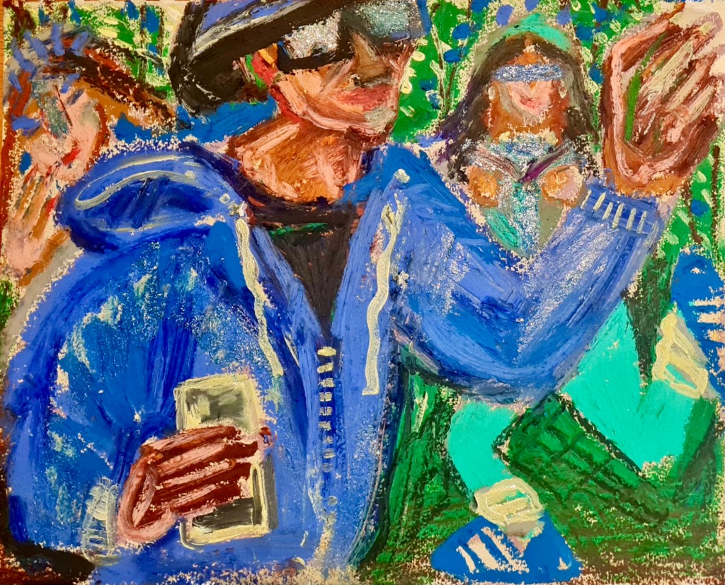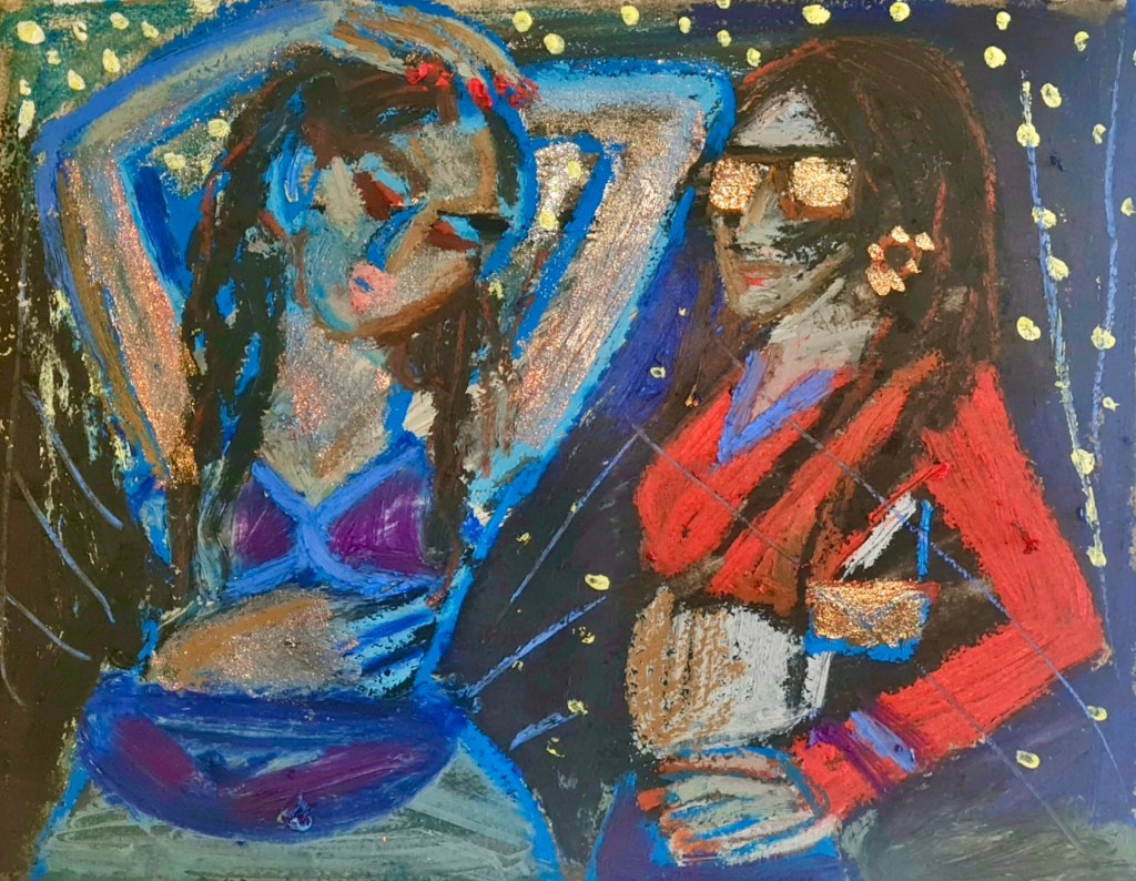 Chatting and portal queues, 30 w x 21 h cm, acrylic and oil pastel on paper, 2022.
