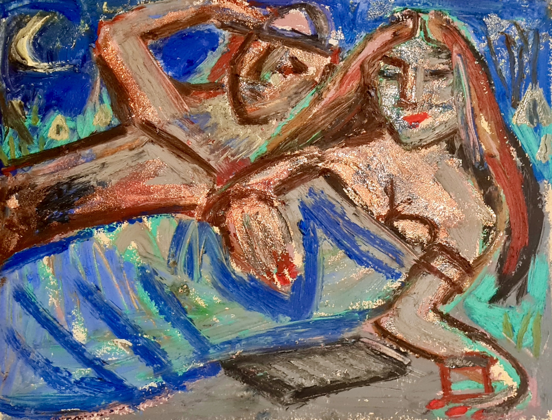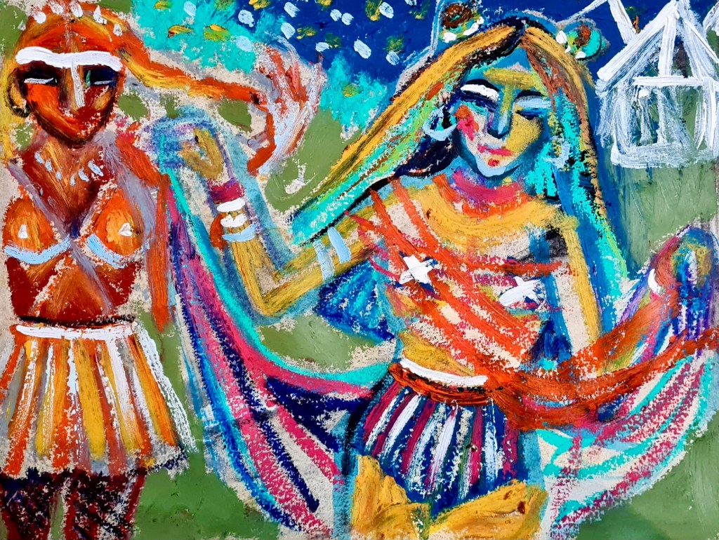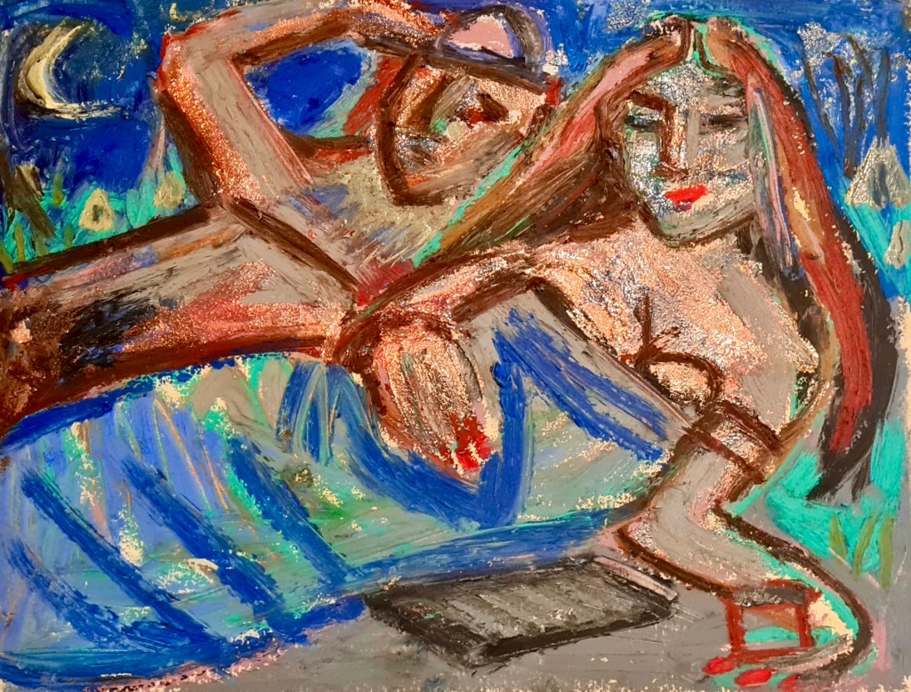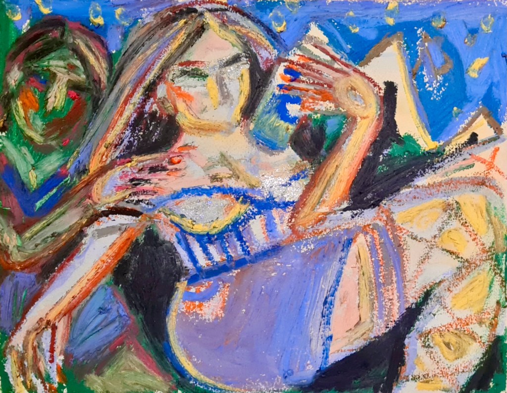 Sleeping under the stars, 30 w x 21 h cm, acrylic and oil pastel on paper, 2022.