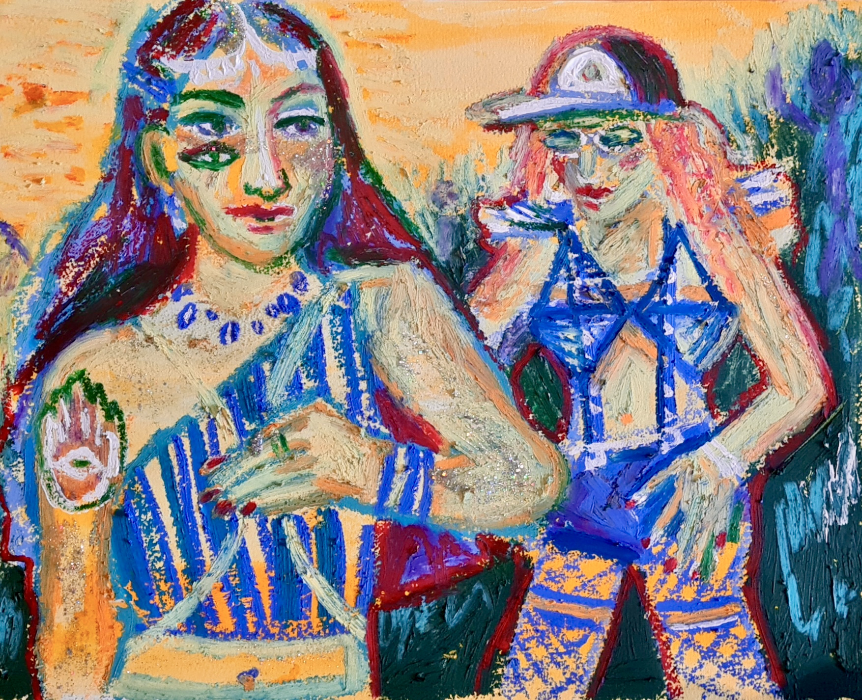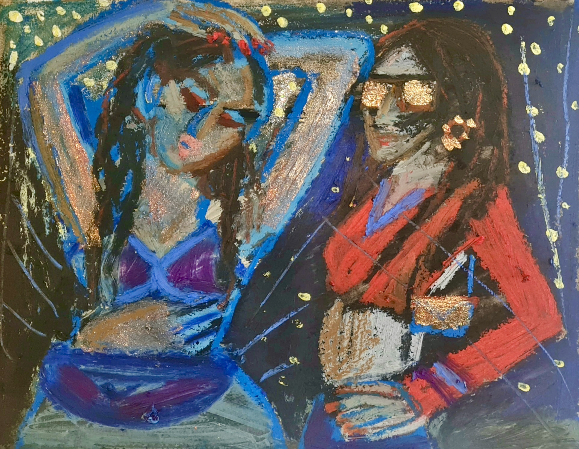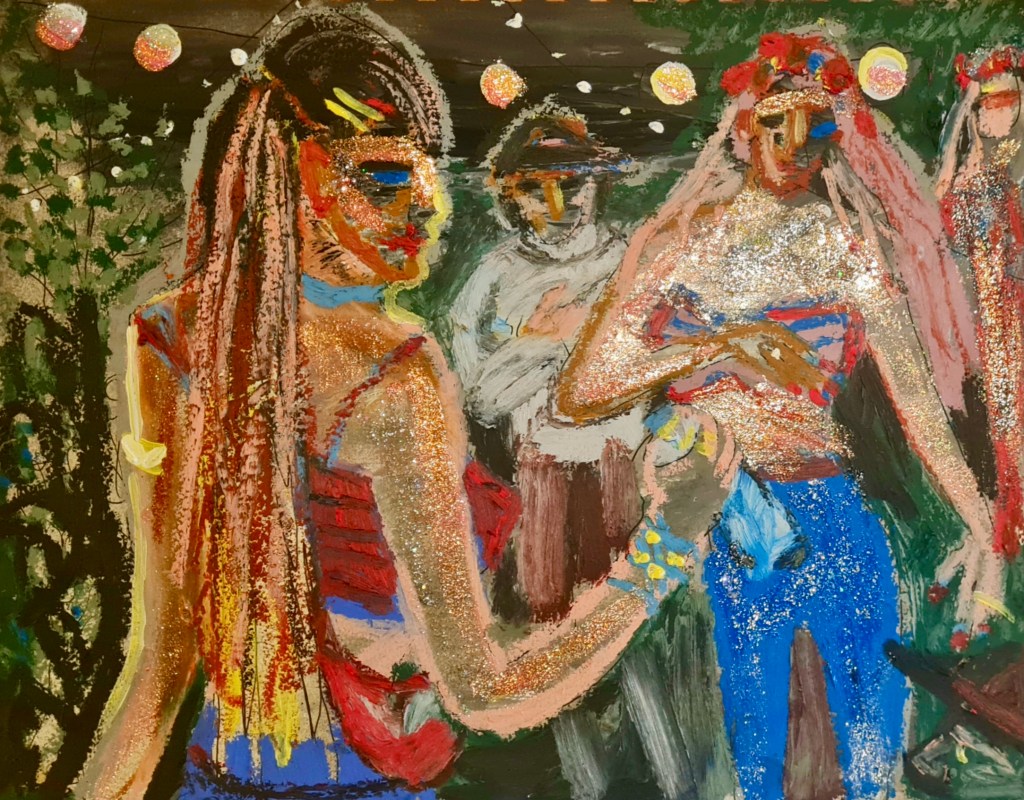 Lights, laughter and love, 30 w x 21 h cm, acrylic, glitter nail polish, pen and oil pastel on paper, 2022.