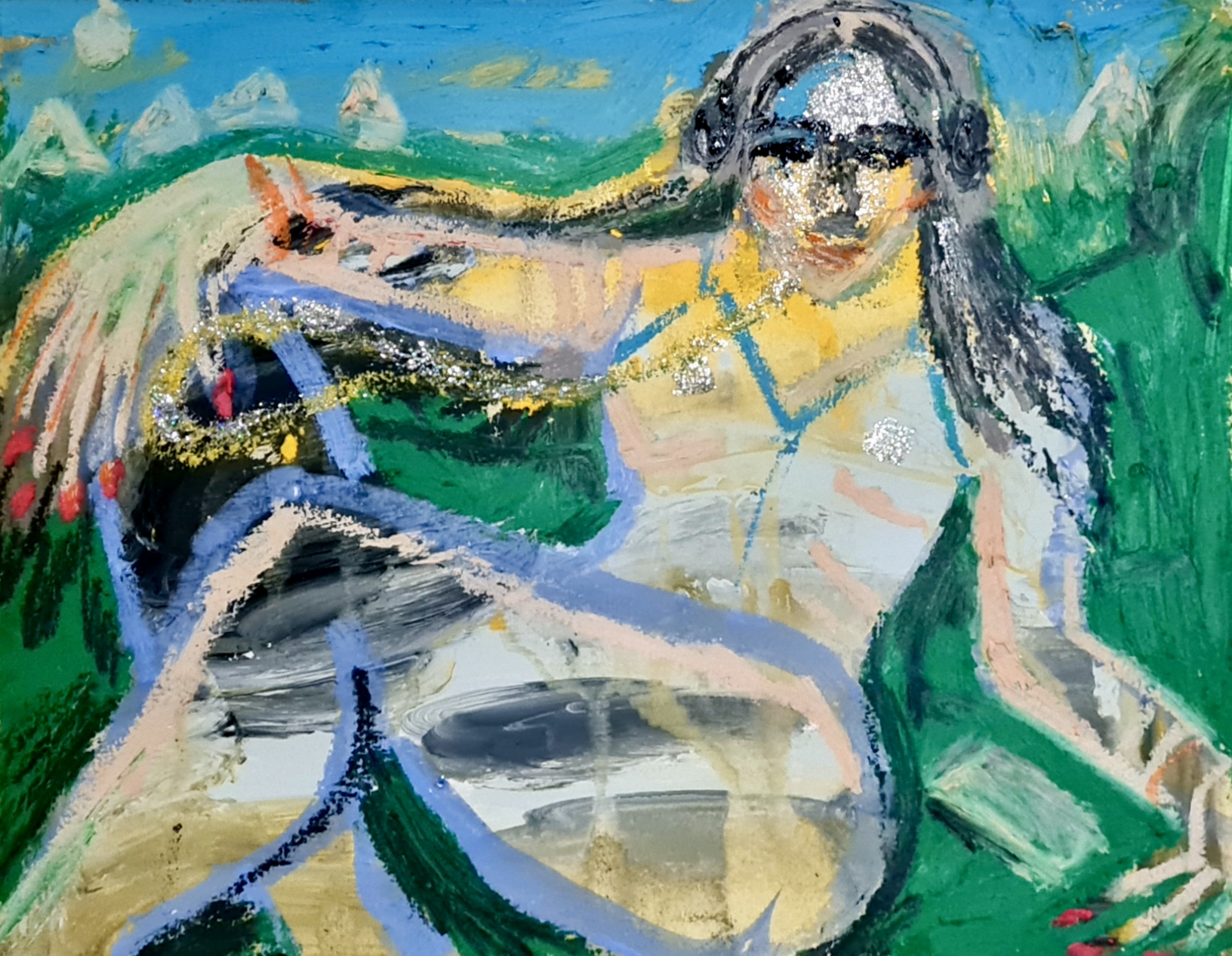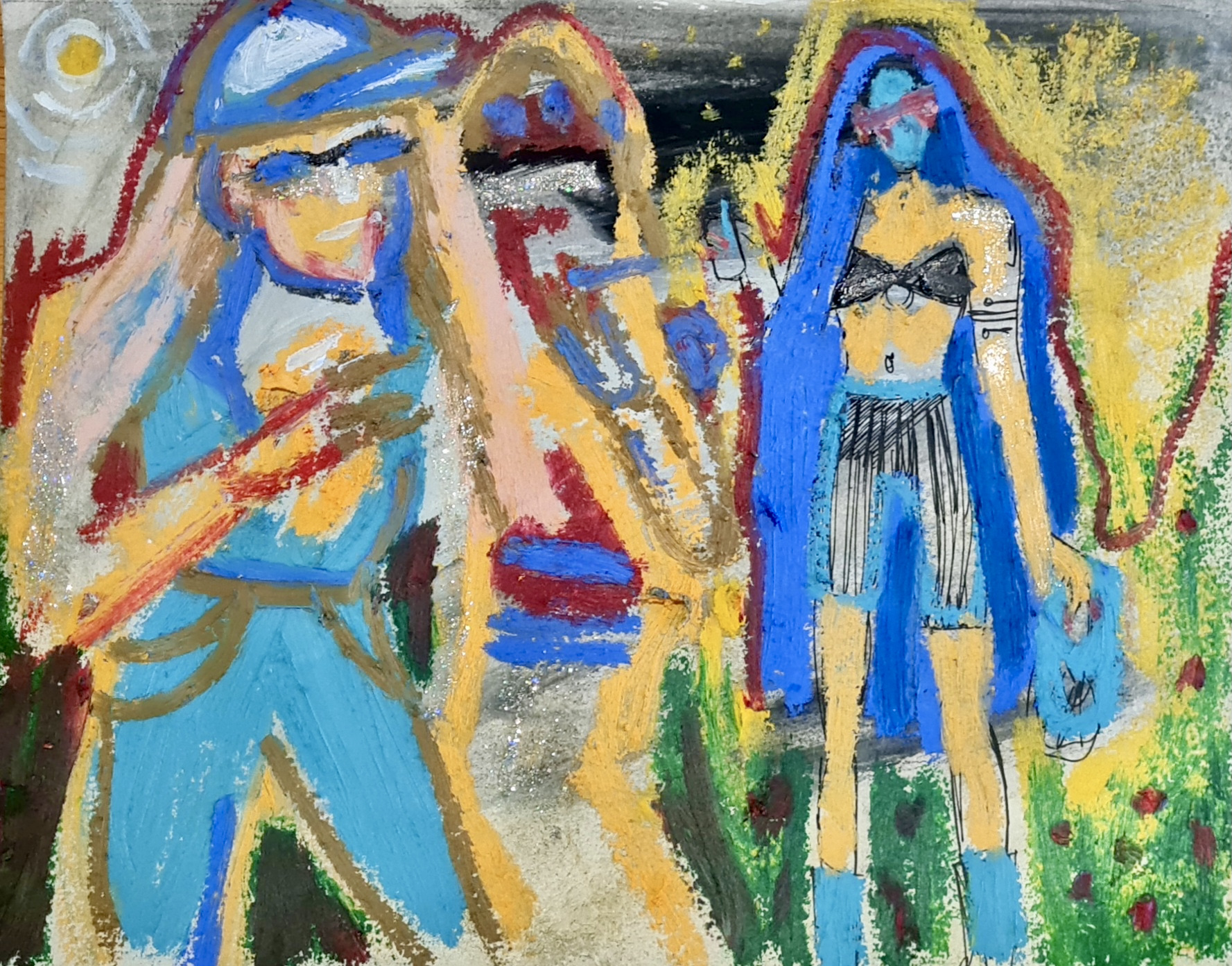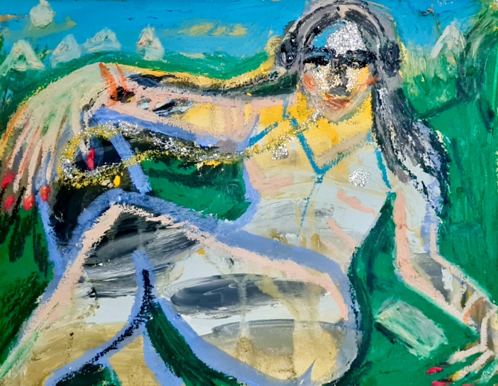 Lost in the music, 30 w x 21 h cm, acrylic, glitter nail polish and oil pastel on paper, 2022.