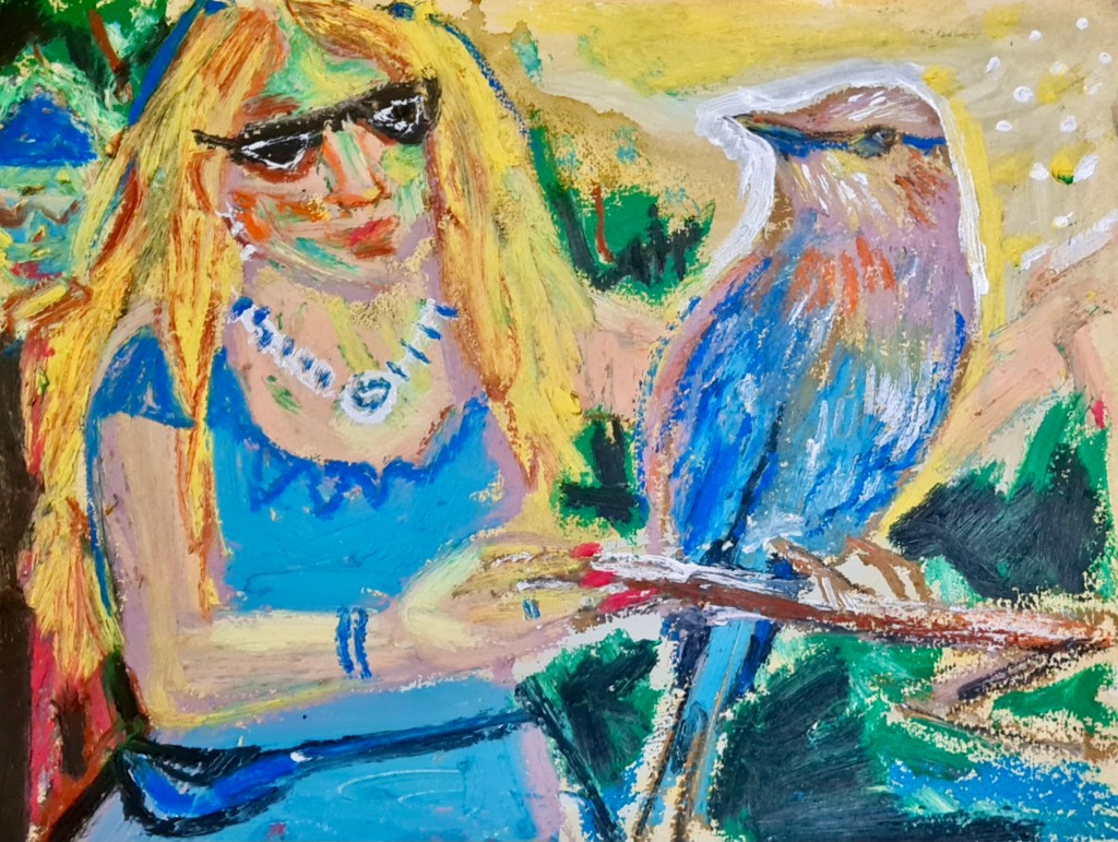 Searching for birds, 30 w x 21 h cm, acrylic and oil pastel on paper, 2022.