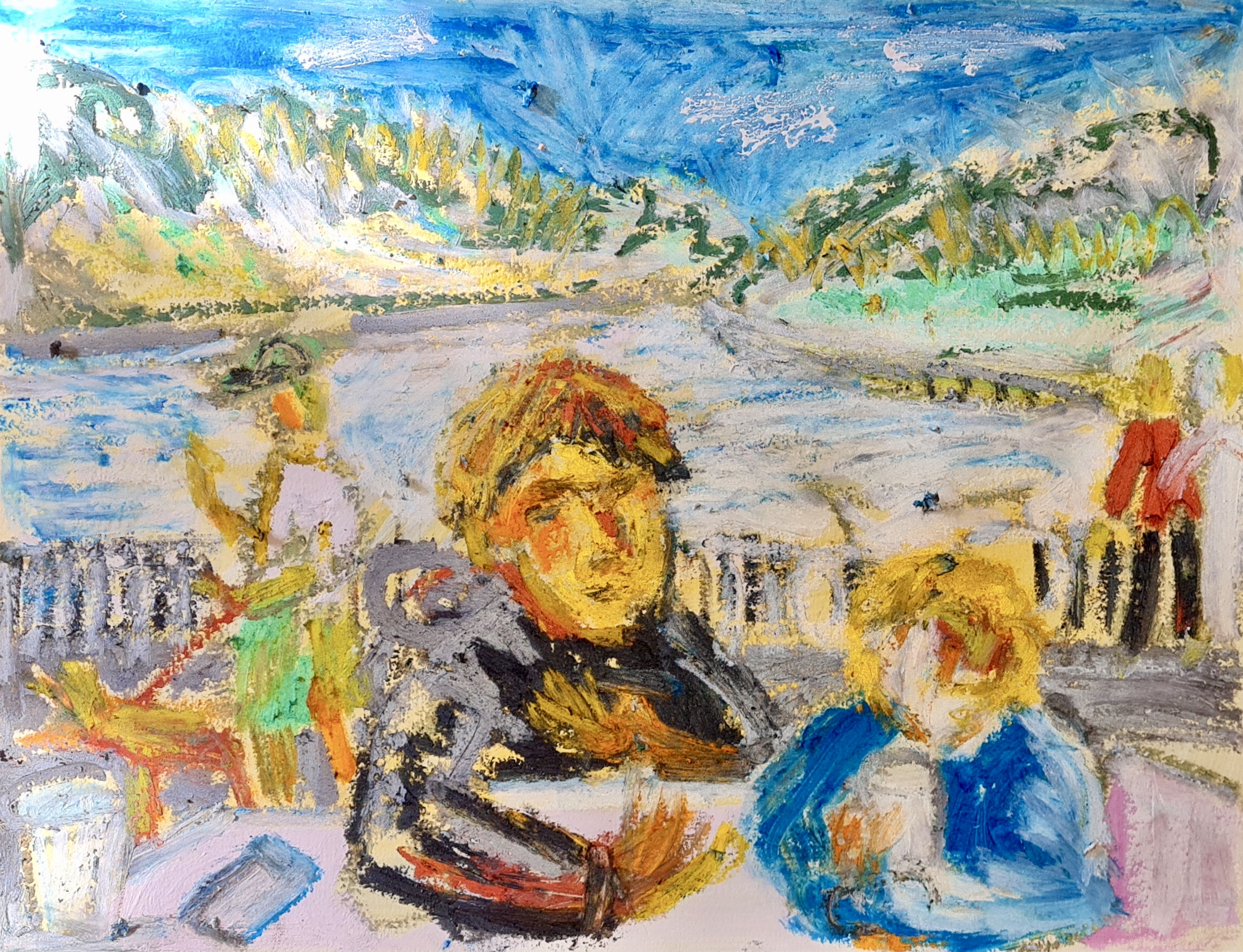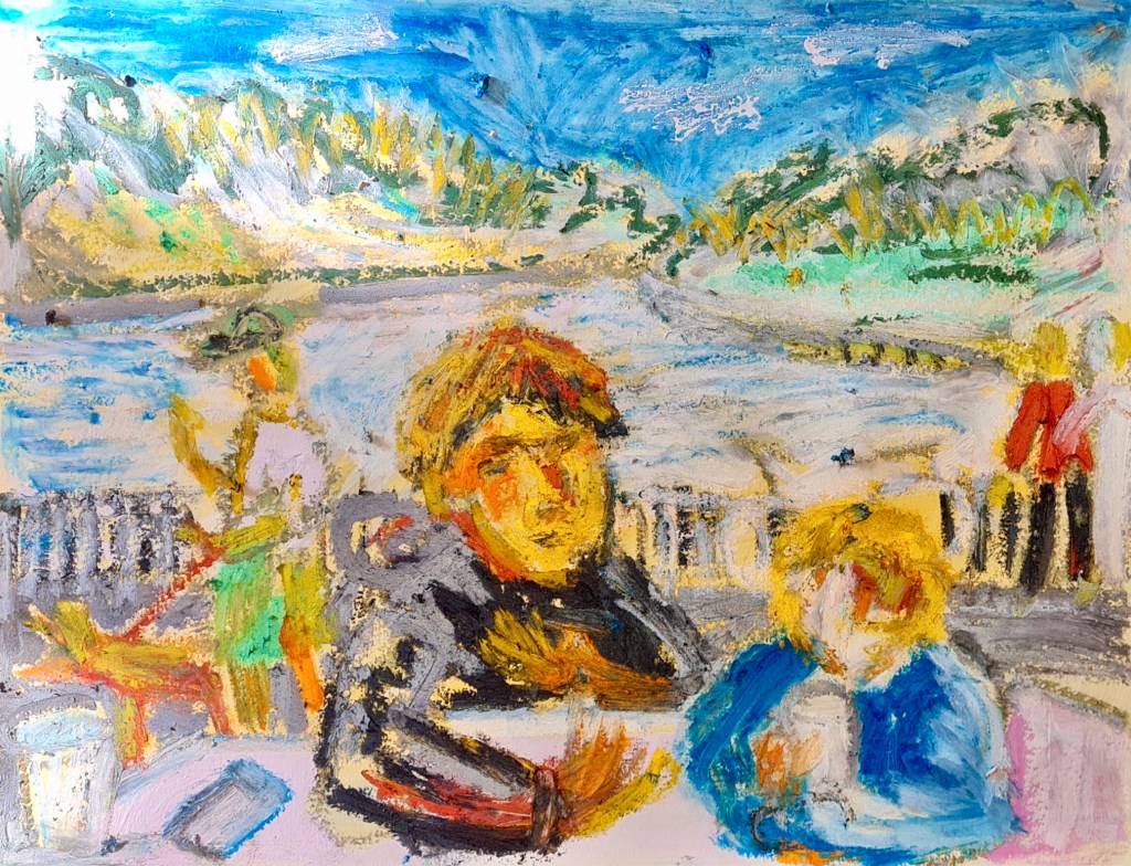 Sefton park and cups of coffee, 22 h x 30 w cm, watercolour, salt, pencil and oil pastel on paper, 2022.