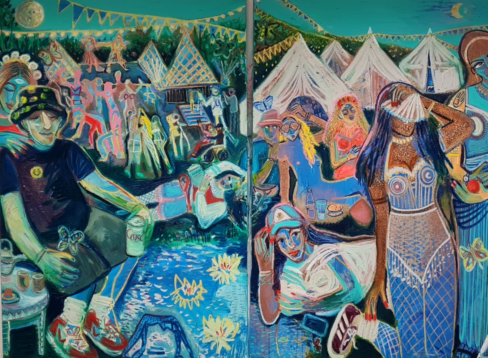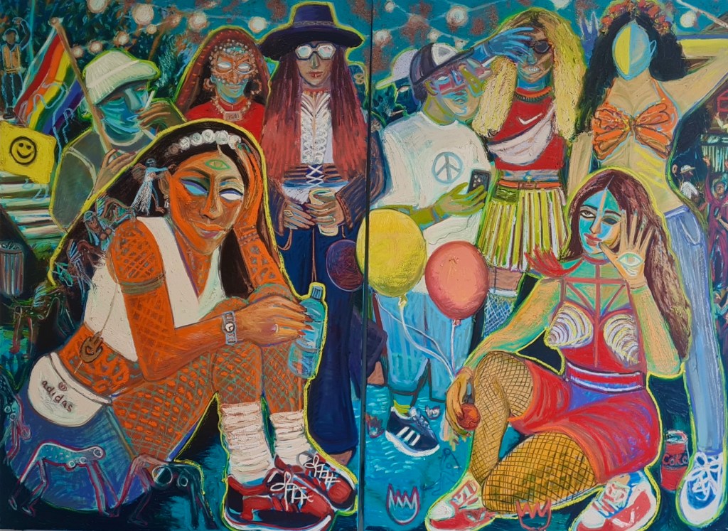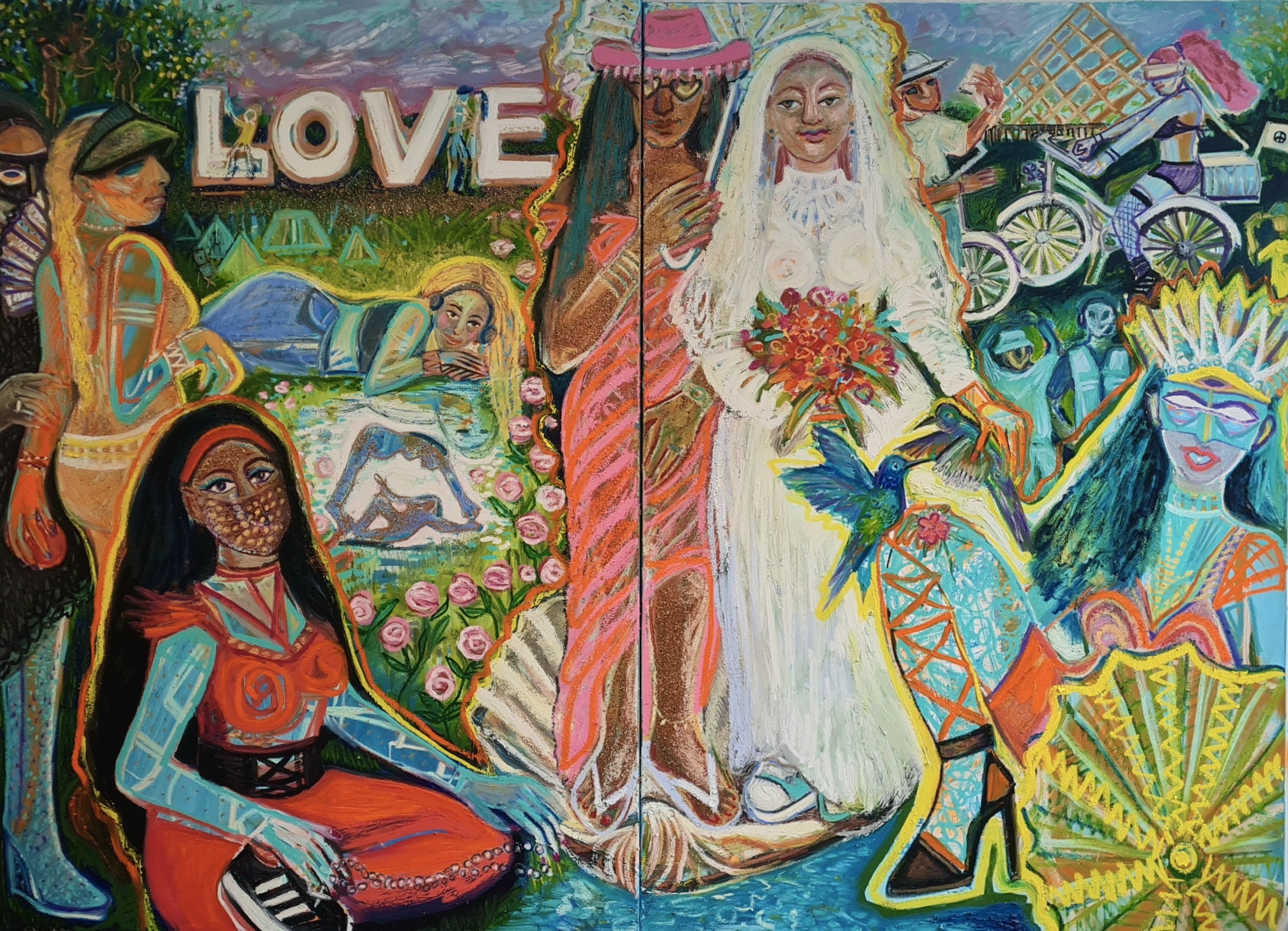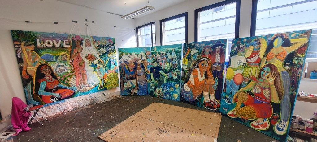 Utopia diptych, 240 w x 180 h cm, mixed media, 2022.Peace – Love – Freedom diptych, 240 w x 180 h cm, mixed media, 2022.Did you find what you were looking for diptych, 240 w x 180 h cm, mixed media, 2022.Studio photograph, Brentford, 2022.