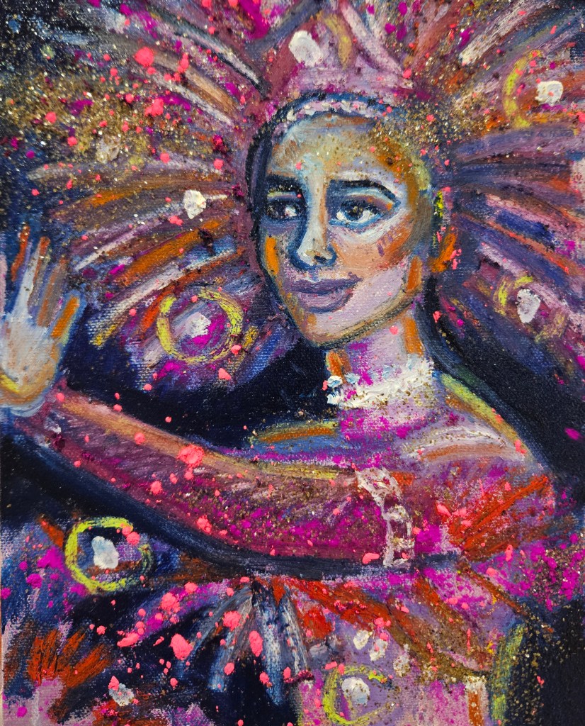 This is a unique series of paintings that capture the essence of a serene coastal landscape. Born from cherished memories of a trip to the island of Jersey, these artworks encapsulate the radiant light and captivating scenery encountered along the seashore. The final 2 paintings are of dancers in costumes, the exude a joy for life, lost in the moment to the beat of the music.