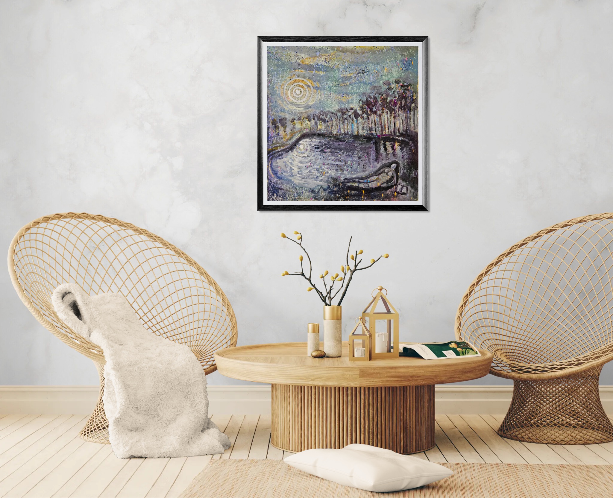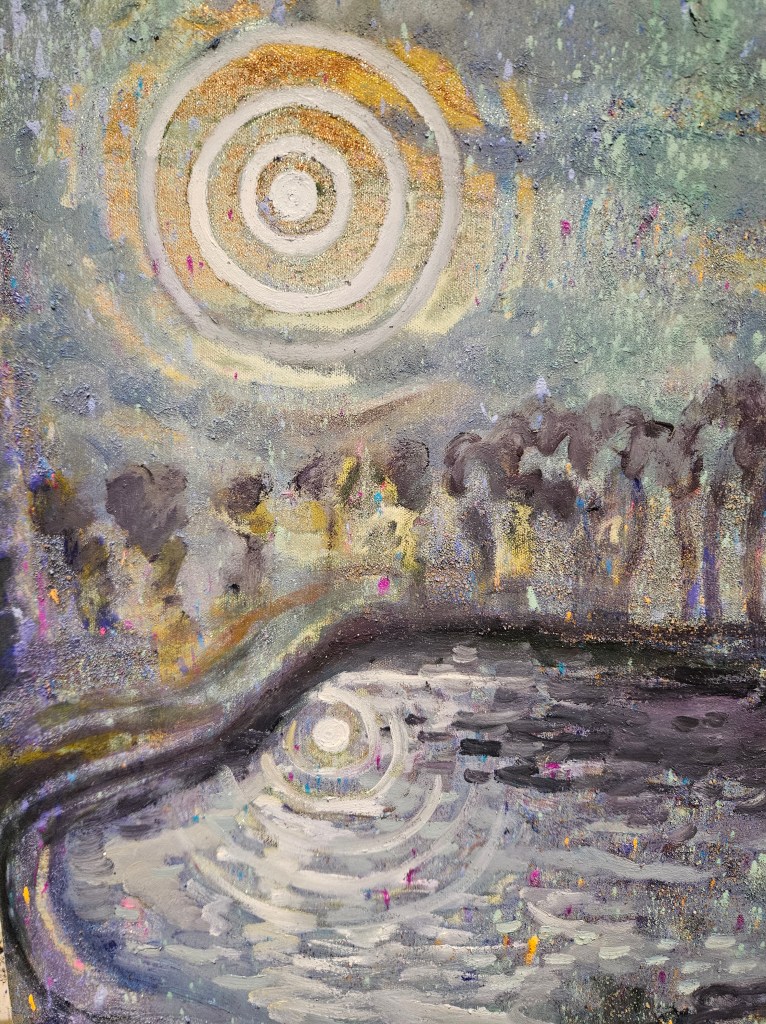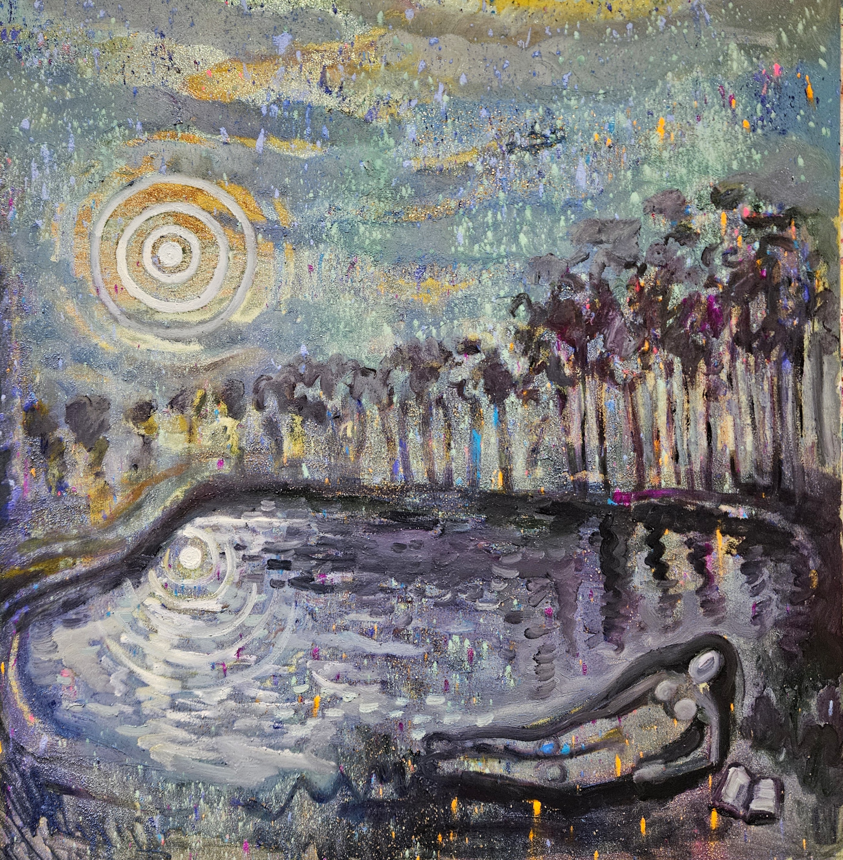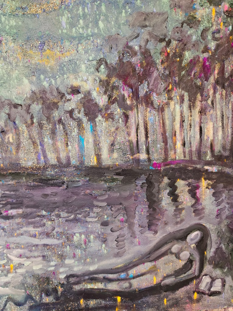 I created this painting after I walked past this beautiful lake on a recent trip to the countryside. The serene beauty of the lake, whether under the moonlight or bathed in the midday golden sunrays, always left me feeling peaceful. The reclining figure in art history has always intrigued me, and I wanted to imagine myself lying down beside the water. The figure you see in the foreground is a self-portrait, a symbol of the inner peace I felt during those days in nature.